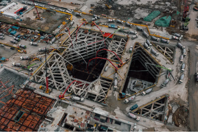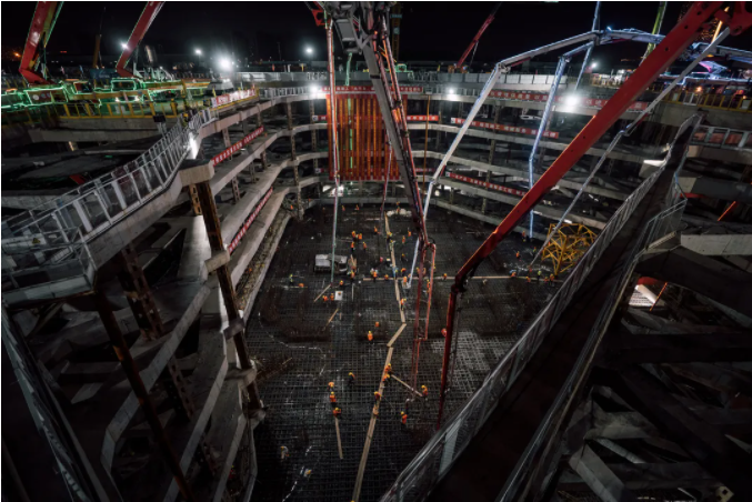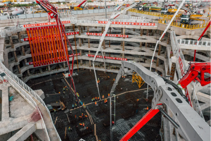 此次大底板混凝土一次性澆筑方量33800立方米、混凝土底板厚度達5500毫米。如此大體量混凝土一次性澆筑,如何有效做好交通組織、施工質量把控工作是澆筑工作中的最大考量,而鋼筋的成功安裝與否是混凝土順利澆筑的前置條件。此次底板主筋選用了HRB500 50mm鋼筋,單根重量140公斤,約56000根、總重達7850噸。單根鋼筋的安裝工作至少需要六名人員協同作業,鋼筋豎向最密集部位設置有23匹。