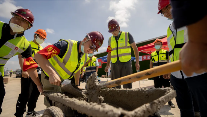 鋼筋綁扎、土方外運、澆筑混凝土……于是我們看到,在澆搗現場,戴著口罩的工人們在做好疫情防護及安全生產的前提下,正開足馬力進行緊張的施工作業。一輛攪拌車在門崗處經過體溫、核酸檢測報告、行程碼、通行證等信息核查后,緩緩駛入工地現場。項目專門成立防疫組,實行一車一查,所有進場人員也需要出具48小時核酸證明。不少工人感嘆“一進現場,各個角落都能聞到消毒水的陣陣“芬芳”。